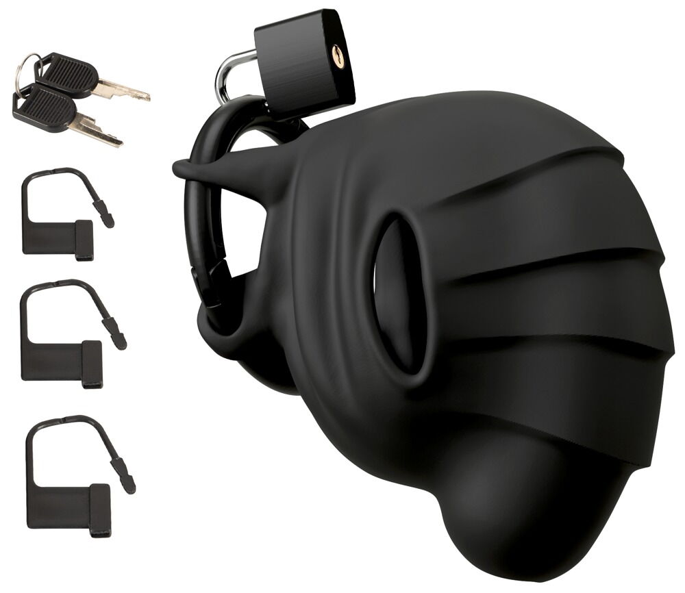 Der Silikon-Keuschheitskäfig Cock & ball cage von Black Velvets schließt Penis und Hoden aufregend ein. Perfekt auf die männliche Anatomie abgestimmt, lässt sich der flexible Käfig leicht an- und ablegen. Das samtig softe Silikon passt sich optimal und komfortabel an. Ein fester Ring hält den leichten Silikon-Käfig fest und sicher am Gemächt. Durch eine untere Öffnung ist urinieren möglich. Selbstverständlich ist der Penis-/Hodenkäfig abschließbar – 1 Vorhängeschloss mit Schlüsseln sowie 3 Einwegschlösser sind inklusive.