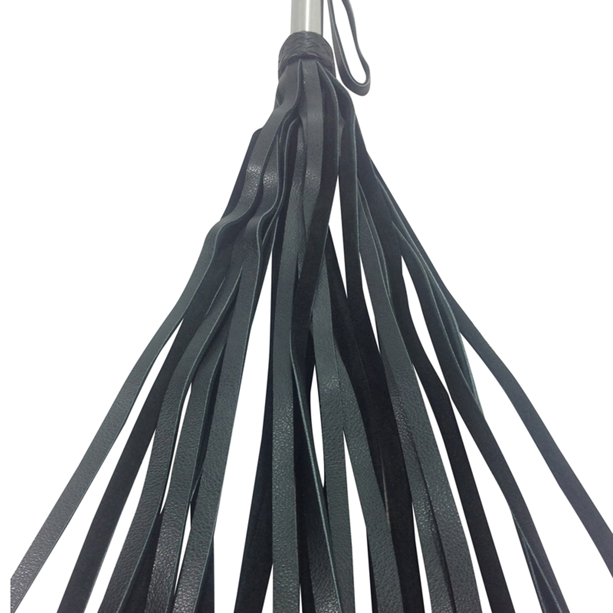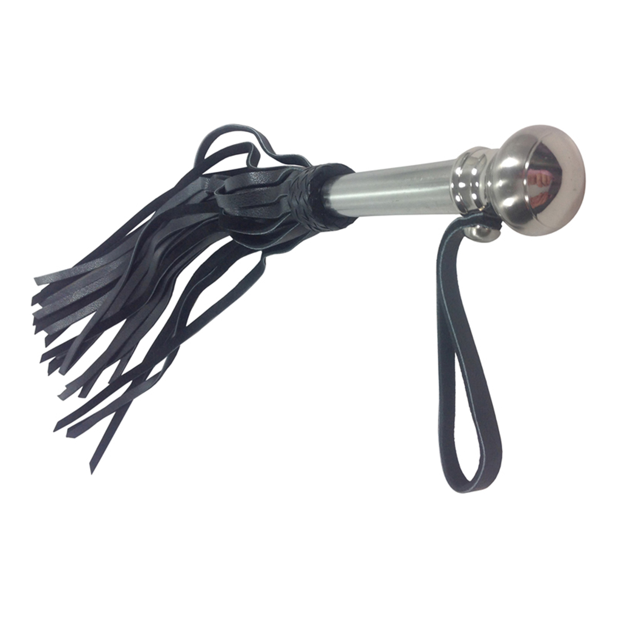 Peitsche mit breiten Lederstriemen und Griff aus Edelstahl mit Halteschlaufe.