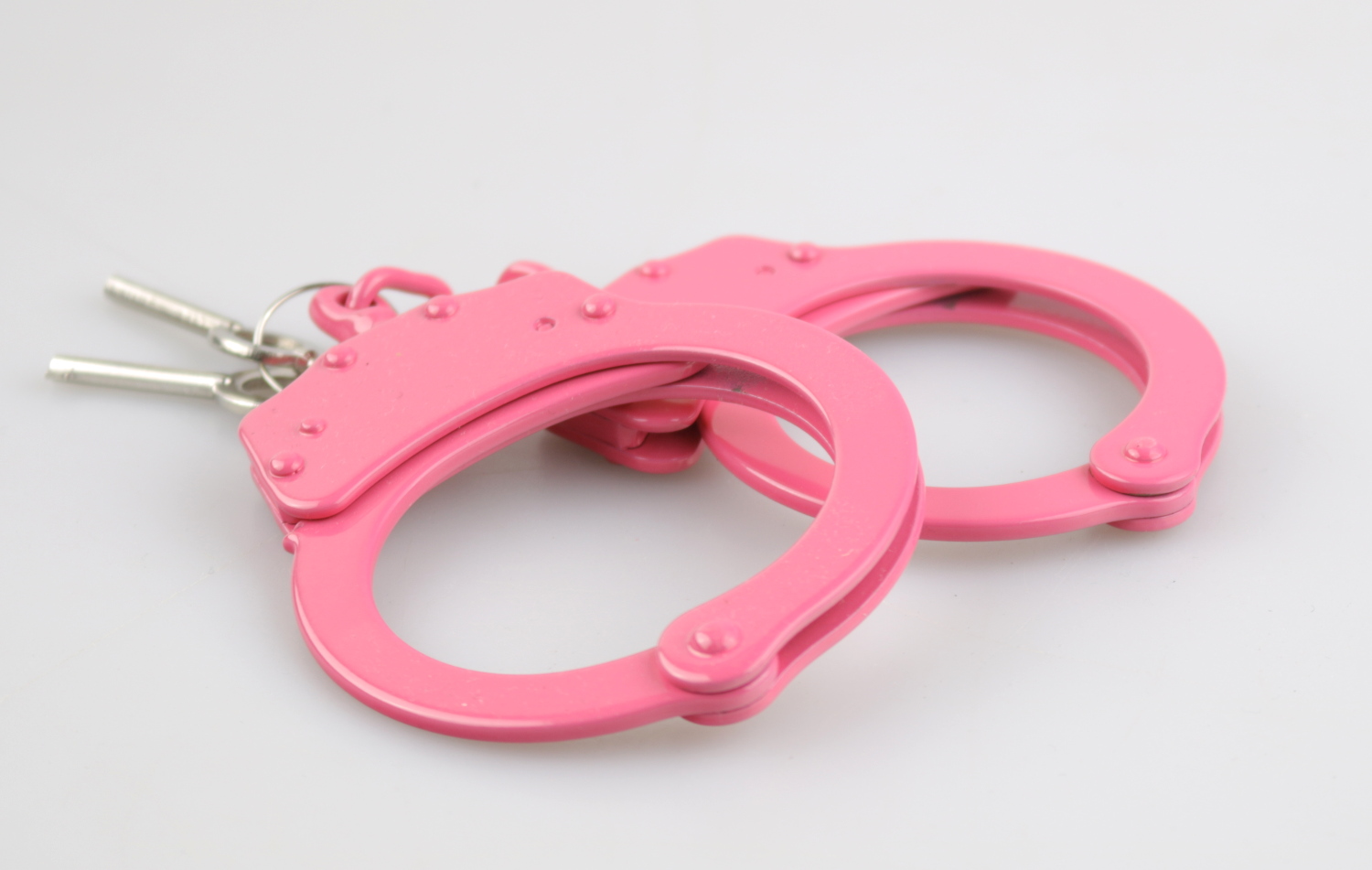 Handschellen aus Metall in pink mit Scharnieren.